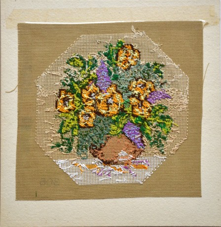 Autor neuveden | Výšivka - kytice macešek v plátěné paspartě | velikost 36,5 x 37,5 cm